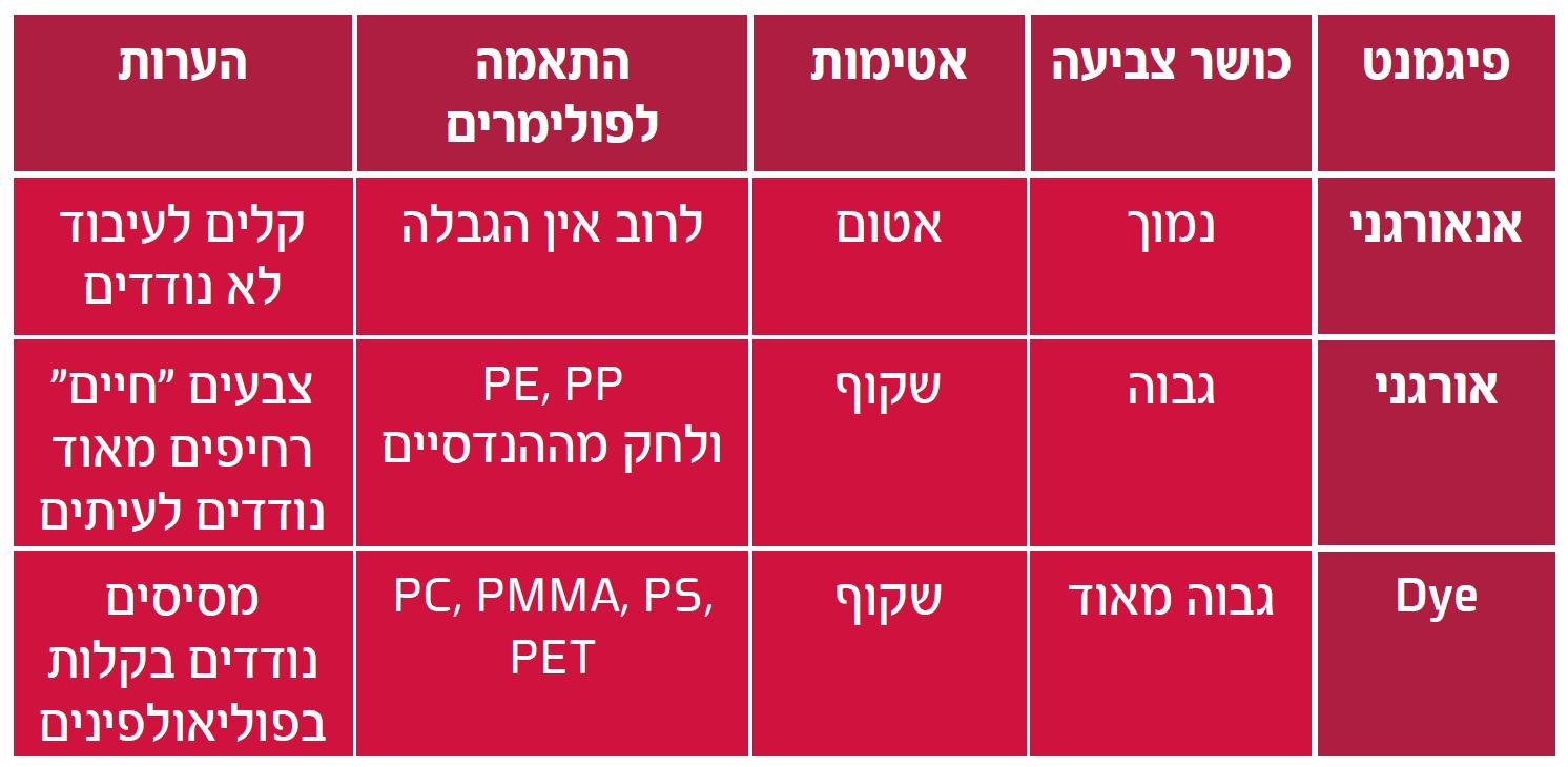 עולם הפיגמנטים רחב מאוד ובבואנו לבחור פיגמנט מתאים נרצה להתייחס לדרישות הלקוח מהמוצר:
