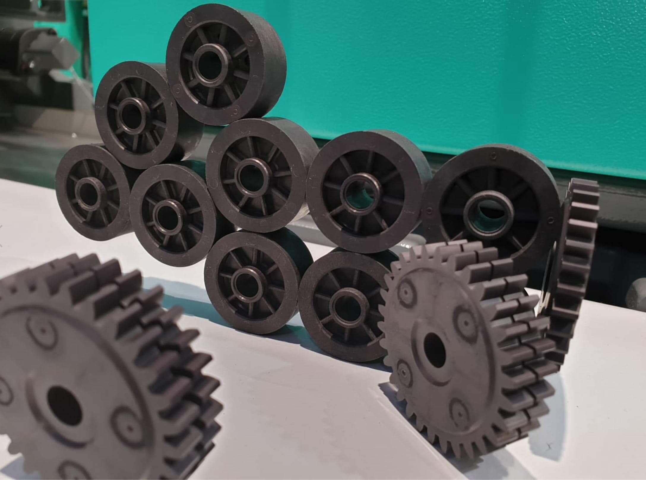 - הזרקת חומר גלם מגנטי העשוי מניילון בתוספת מלאנים מגנטיים (פריטים) (תמונה 4). הייחודיות בתהליך זה מתמקדת בצורך להקנות כיווניות לתוסף המגנטי, כל עוד הוא עדיין בתבנית במצב היתך, על מנת להקנות לו תכונות פונקציונאליות. פעולה זו נעשתה ע"י שילוב מגנטים בתבנית היוצרים את הקוטביות. גם מכונה זו הייתה חלק מתא ייצור שכלל גם בדיקת הפונקציונאליות של החלק בעזרת רובוט ולוח מגנטי.