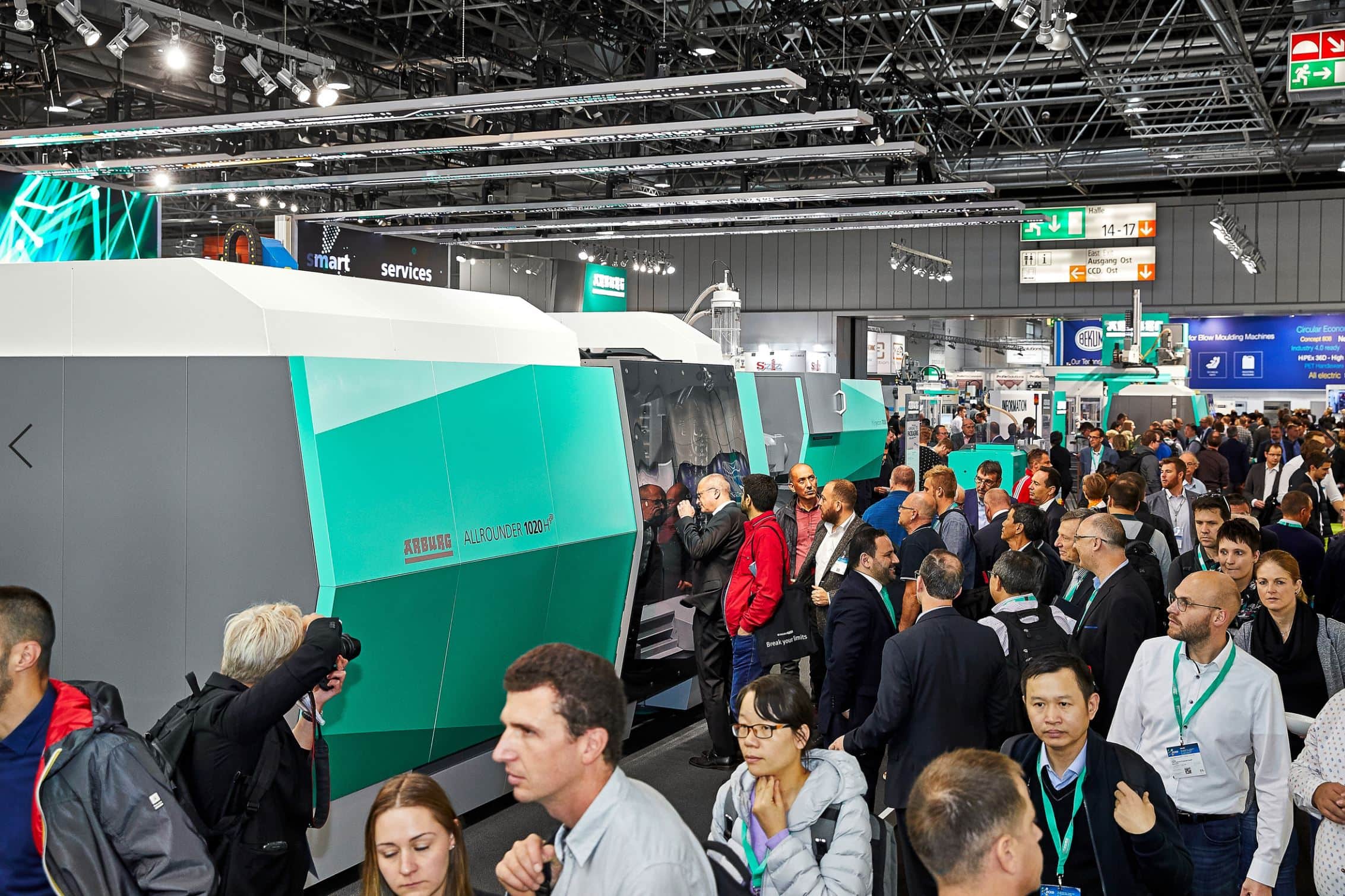 - גולת הכותרת של הביתן, מכונה חדשה, ה-Allrounder 1020 H, בכוח נעילה של 600 טון. המכונה הוצגה עם יחידת הזרקה בגודל 7000. היא מתאימה ליישומי אריזה, למוצרים דקי דופן, ותומכת במהירות עבודה גבוהה. בתערוכה יוצרו דליים במשקל 208 גרם, עשויים PP ממוחזר ברמה של 30%, בתבנית בעלת 8 מובלעות – כל זאת בזמן מחזור של 4 שניות בלבד. לסרטון בנושא