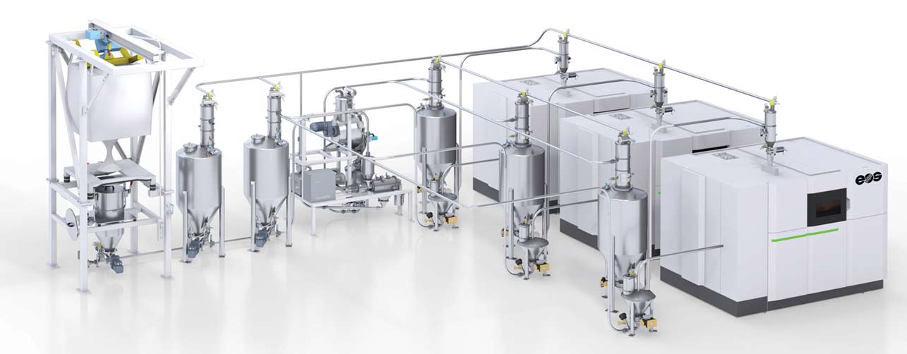 הפתרון מבוסס על מערכת מרכזית אחת המשרתת מספר מדפסות תלת ממד. מכונה לריקון שקי ביג-באג מאפשרת פריקה של האבקה בצורה בטיחותית ובמעגל סגור עם מינימום שחרור אבק. היא מתאימה למגוון גדלים של ביג-באגים, מאפשרת הרמה נוחה שלהם מהמשטח, וכוללת אפשרות לריקון עם ויברציה או ציוד העוזר לחומרי גלם עם זרימה נמוכה. לחילופין, החברה מציעה מכלי הזנה אליהם ניתן לרוקן שקים, הכוללים פילטרים ומערכות אוורור לאבק, בנוסף למסננים. האבקה משונעת לשני מכלי ביניים באמצעות מערכת שאיבה פנאומטית עדינה, ומשם למערכות הסינון.