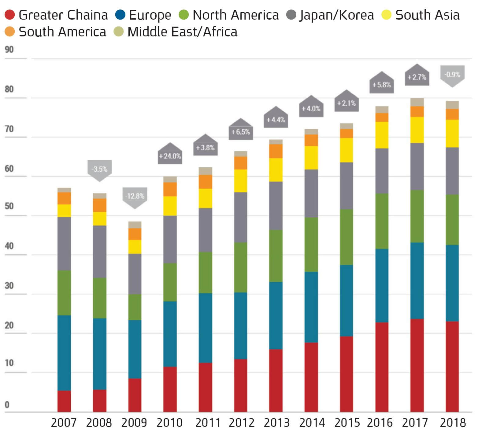 תמונה 1: שינויים במכירות ציוד בעולם לתחום הפלסטיק והגומי, בסין, אירופה ובעולם. מקור: Euromap.