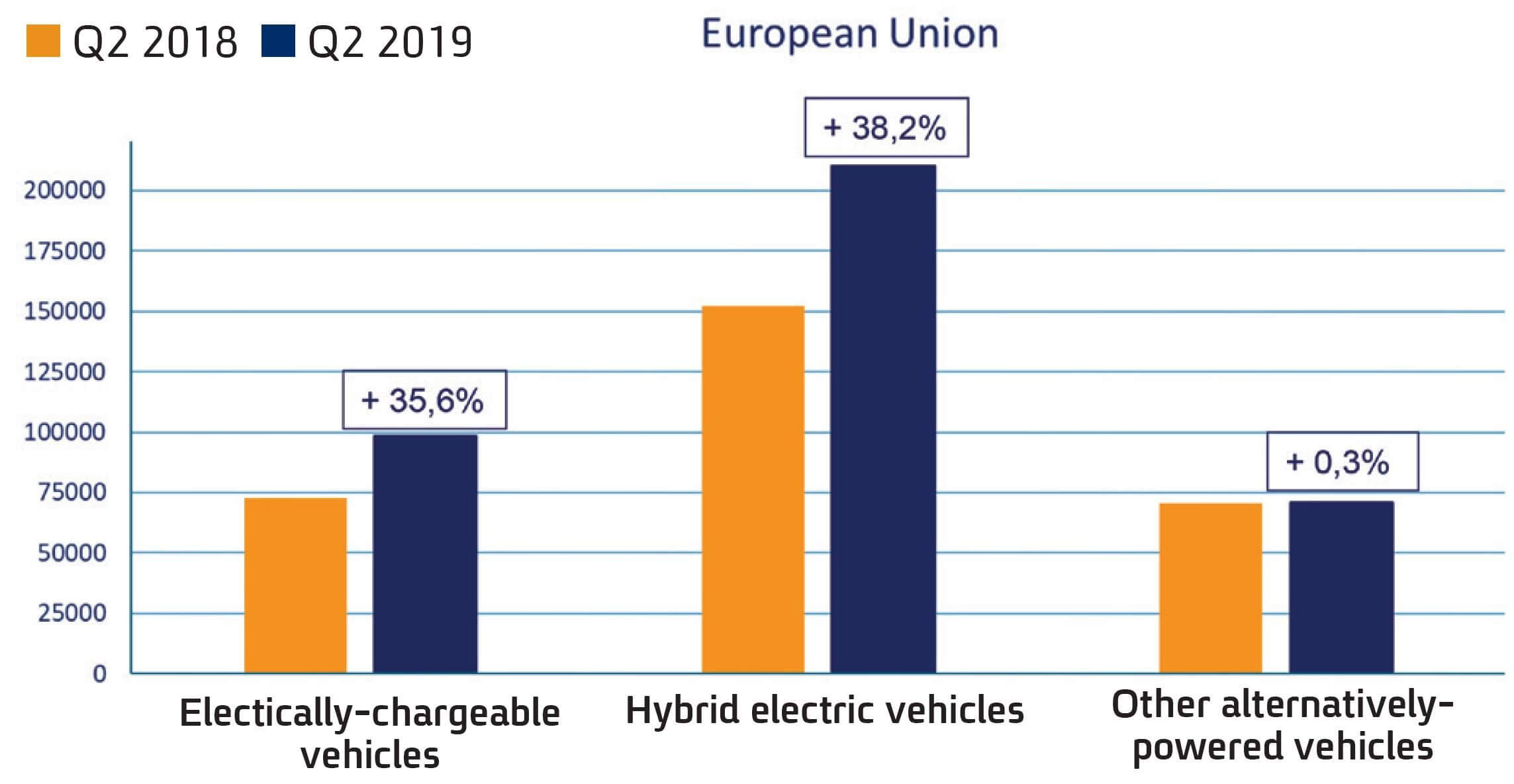 תמונה 3: שינויים ברכבי הנוסעים הרשומים באירופה, בשוואה שין הרבעון שנים של 2018 ובין הרבעון השני של 2019. מקור: European Automobile Manufacturers Association