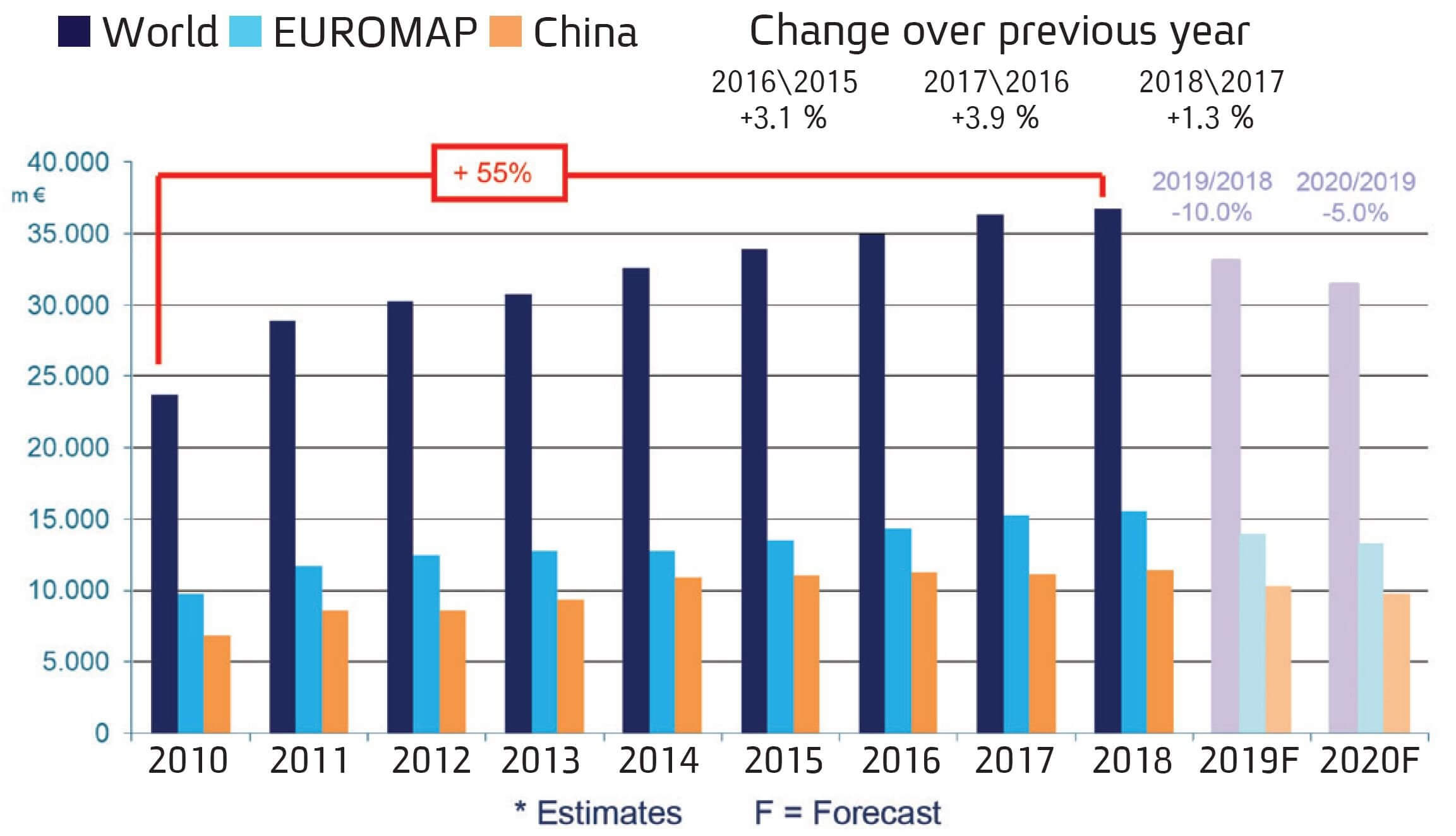 Euromap, ארגון על אירופי המאגד בתוכו 9 קבוצות סחר אירופאיות בתחום הפלסטיקה והגומי, מדווח על ירידה צפויה במכירת המכונות לתעשייה בשנת 2019. לאחר 10 שנים של עלייה רצופה במכירת המכונות המסתכמת ב-55%, שנת 2019 צפויה להראות ירידה של כ-10 אחוזים במכירות. מגמה זו צפויה להמשיך גם בשנת 2020 בה חזויה ירידה של כ-5 אחוזים נוספים (תמונה 1).