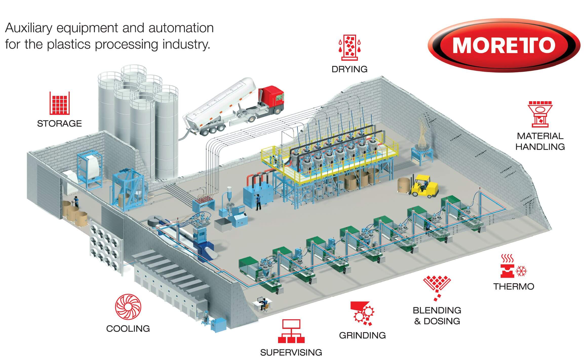Moretto מתמחה במגוון רחב של יישומים כגון: שינוע, ייבוש, מינון, גריסה, קירור, חימום ואחסון של חומרי גלם לתעשיית הפלסטיק.