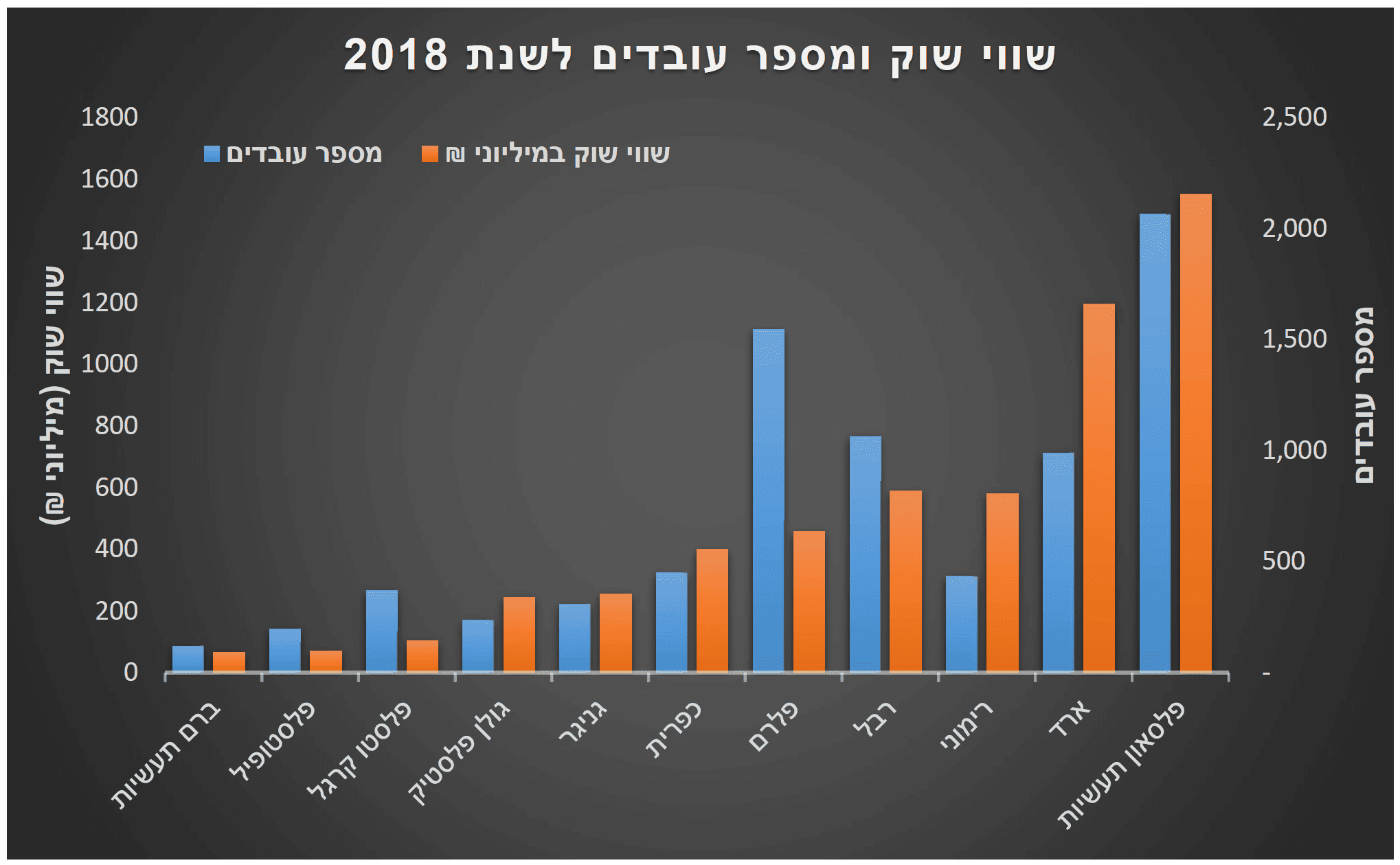 אחד עשר חברות בסקטור הפלסטיקה נסחרות בבורסה של ת"א. נכון לסוף 2018 מעסיקות כולן יחד 7,780 עובדים, כ-10% יותר מהשנה הקודמת.