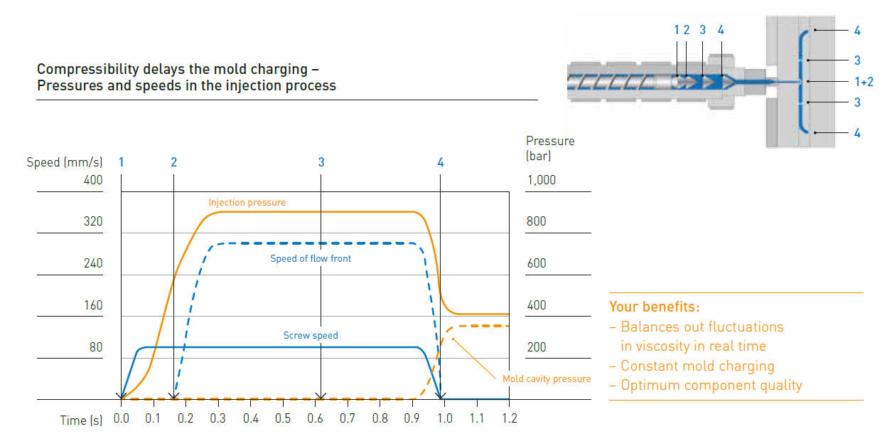 חומרים פלסטיים הינם בעלי תכונות זרימה שונות ולחץ ההיתך משתנה בין פולימרים שונים. כאשר לחץ ההיתך גבוה, פחות היתך זורם לתוך שקע התבנית והלחץ הפנימי בתוך התבנית נמוך מדי. לחץ היתך נמוך יוצר מצב בו יותר מדי היתך זורם לתוך שקע התבנית והלחץ הפנימי בתוך התבנית גבוה מדי. כפי שניתן לראות בתמונה 2, מערכת APC Plus לוקחת בחשבון את הפרשי הלחצים, ויודעת איך לשמר נפח אחיד של היתך המתאים למילוי מקסימלי של התבנית.