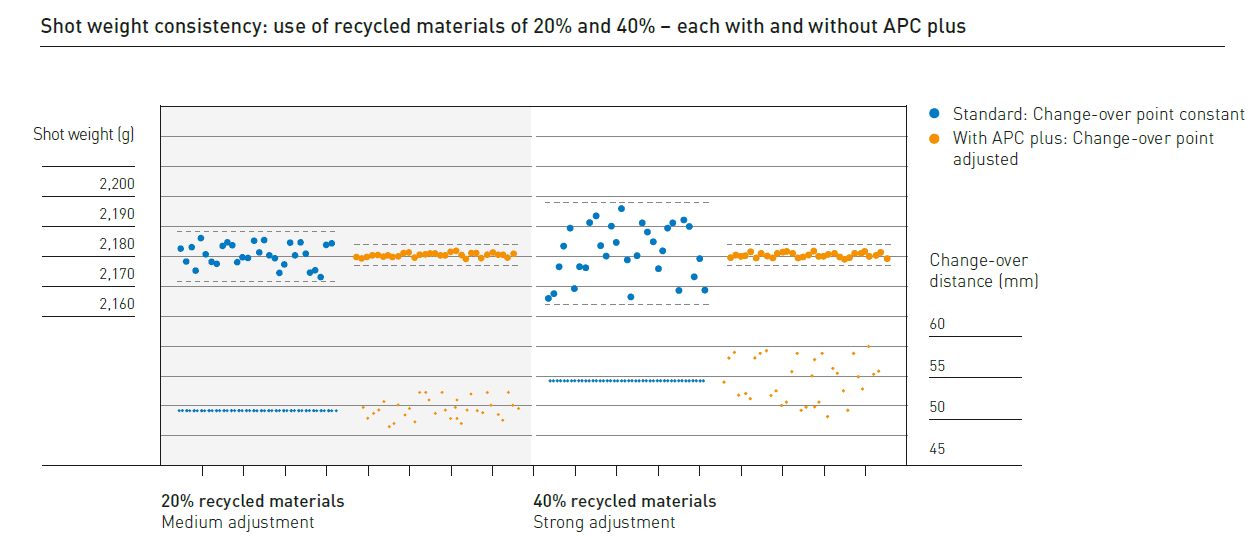 שימוש במערכת APC plus מאפשר להעלות את אחוז החומר הממוחזר במוצר תוך שמירה על איכות מוצר טובה. בתמונה 3 ניתן לראות כי גם לאחר הכפלת אחוז החומר הממוחזר המערכת מצליחה לשמור על אחידות המוצר המוזרק, משקלו נשאר דומה למשקל המוצר עם אחוזי חומר ממוחזר קטנים יותר.