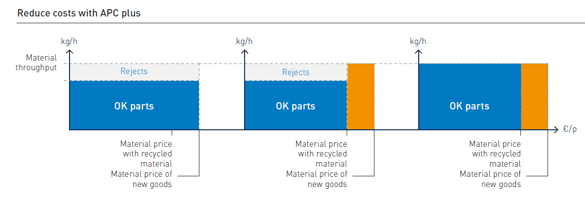 הגורמים הקובעים את מחיר המוצר נגזרים מעלויות החומרים ומכמות הפסולים בתהליך הייצור. צמצום עלויות והגדלת שולי הרווח מהווים אתגרים משמעותיים בכל ארגון. מערכת APC Plus מאפשרת את הגדלת אחוז החומר הממוחזר במוצר הסופי ובכך מצמצמת את עלויות המוצר בצורה משמעותית וכן מקטינה באופן משמעותי את פחת של מוצרים פסולים. יותר מוצרים איכותיים מיוצרים עבור כמות חומר גלם נתונה ומכאן, פחות איבוד של חומר גלם, כפי שניתן לראות בתמונה 4.