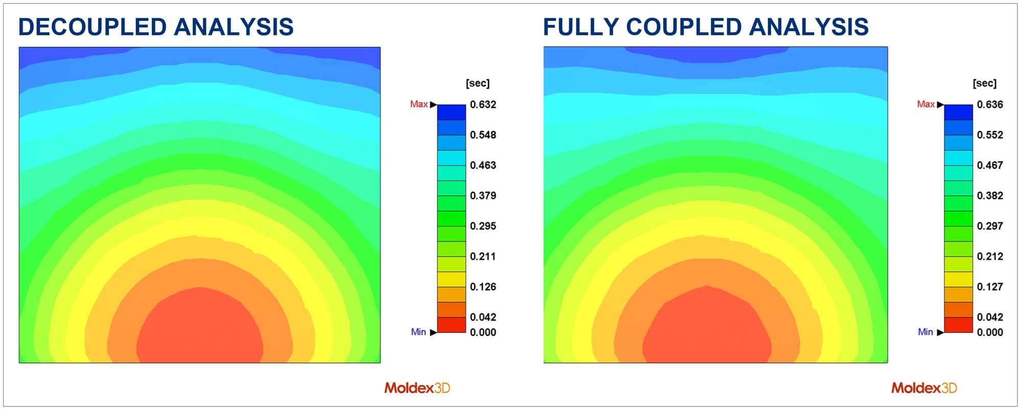 תמונה 2: סימולציה מילוי עם צימוד זרימה-סיבים (ימין) לעומת סימולציות עם סיבים קודמות (שמאל).